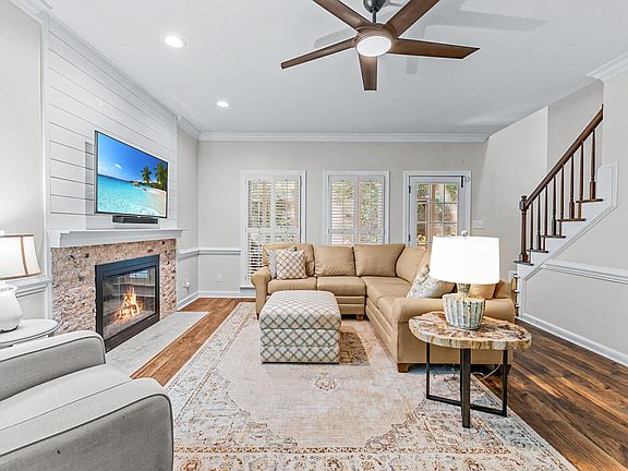 Nestled in a prime North Raleigh location, this stunning end-unit townhome offers a blend of modern elegance and cozy comfort, perfect for those seeking a tranquil yet convenient lifestyle. This home features not just one, but two luxurious owner's suites. The first-floor suite offers ultimate convenience and privacy, while the second-floor suite is a true retreat, boasting a spacious spa-inspired bathroom and an oversized walk-in closet. Inside, beautiful LVP flooring flows seamlessly throughout, enhancing the home's spacious and airy feel. The gourmet kitchen is a chef's dream, with sleek stainless steel appliances, granite countertops, and under-cabinet lighting that highlights every detail. Plantation shutters add a touch of sophistication, while the gas fireplace in the living area invites you to relax and unwind. Step out onto your screened-in porch and take in the peaceful wooded view—the perfect spot for morning coffee or evening relaxation. With a new hot water heater and modern finishes throughout, this home is move-in ready and designed for easy living. Don't miss the opportunity to own this exceptional home in one of North Raleigh's most desirable communities. Schedule your private showing today!