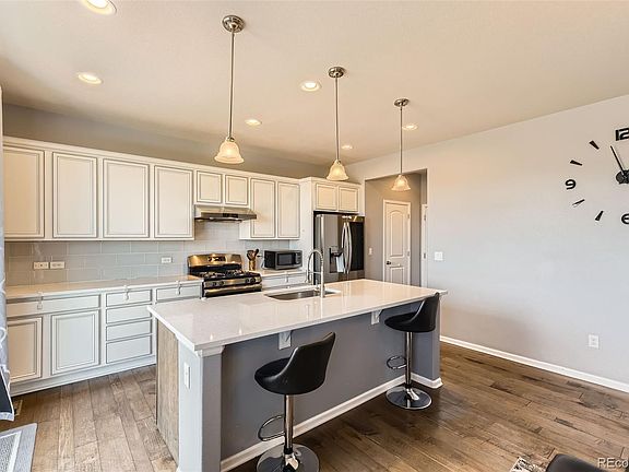 This beautiful 2-story home offers everything you've been looking for — 4 bedrooms, 3 bathrooms, a large upstairs loft, and an unfinished garden-level basement ready for your personal touch. Step into a light-filled main floor featuring an open-concept layout with a stunning kitchen equipped with quartz countertops, a gas cooktop, stainless steel appliances, an expansive island, and a walk-in pantry. A flexible front room easily adapts to your lifestyle — perfect as a formal dining room, home office, or additional living space. The inviting family room boasts a cozy gas fireplace, and the adjacent mudroom adds practical storage. Upstairs, the spacious loft pairs perfectly with four generously sized bedrooms and a convenient laundry room. Retreat to the luxurious Primary Suite with its spa-like 5-piece en-suite bath, featuring double sinks and a soaking tub. The customized California Closet is a showstopper — ultra-organized and spacious. Enjoy outdoor living in the fully fenced backyard that backs to a serene greenbelt. The deck is equipped with a gas line — ideal for summer grilling. Bonus features include access to trails, parks, the new Rec Center, and Aurora Reservoir.