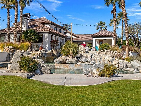 Spectacular HORSE PROPERTY Estate on 1.5 Acres in Thousand Palms - FULLY FURNISHED & SHORT-TERM RENTAL FRIENDLY! Welcome to a masterfully crafted custom estate, designed by the original builder for their family. Resting on a fully gated 1.5-acre lot, this private sanctuary offers 5 bedrooms, 5 bathrooms, & an impressive 6-car garage with dedicated RV parking. A grand circular driveway, framed by a Spanish water fountain, sets the stage for timeless elegance. Inside, the formal living room welcomes you with serene views of the resort-style pool. The chef's kitchen blends sophistication and functionality with custom wood cabinetry, quartz countertops, a SubZero refrigerator, and a commercial-grade stove. The expansive island offers a seamless connection to the cozy family room, anchored by a stone fireplace and oversized glass doors leading outside. The primary suite serves as a luxurious retreat with a spa-like bathroom, soaking tub, and walk-in closet. A private wing with its own entrance and living area adds flexibility for guests or multigenerational living. Upstairs, you'll find two additional guest bedrooms and an impressive movie theater, offering a private space for entertainment and relaxation. The 5-tiered resort-style pool is the crown jewel, cascading elegantly through multiple water features to tanning decks below--creating an entertainer's dream setting. With outdoor bar areas, lush landscaping, & panoramic views, this estate delivers luxury and privacy at