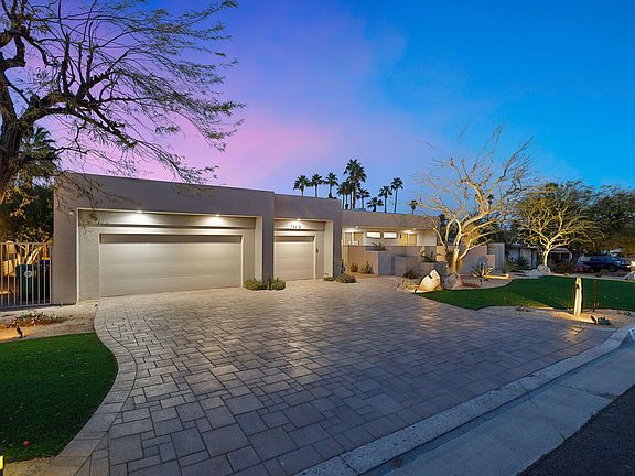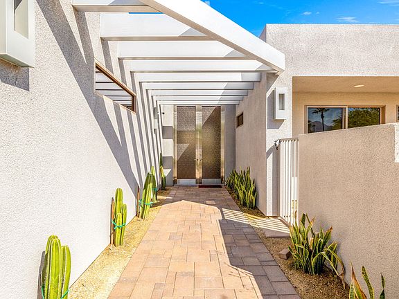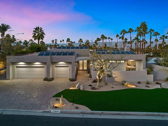 Welcome to the luxurious living in South Palm Desert! This rare find has been fully renovated with 52 owned Solar Panels. As you walk up to the breathe-taking double front doors you will notice the paved driveway! Upon entry you will walk into soaring 12' ceilings with spectacular views! Custom cabinetry, granite slab counter tops, with dramatic light fixtures through out. A chefs dream kitchen with Dacor appliances, double ovens, wine refrigerator, dishwasher, and refrigerator. The master suite offers mountain views from your bed with the touch of a button with electric blinds. When it's time to relax step out into your backyard oasis with a built in BBQ, salt water pool, with a covered patio. This is desert luxury living you will not want to miss.
