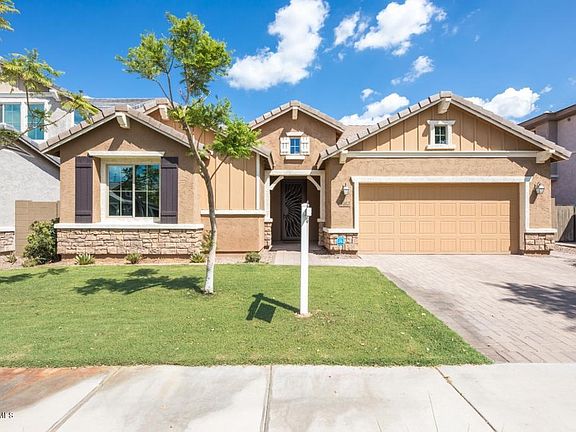 Charming single story home with modern interior in the Gilbert community of Morrison Ranch. Stone accents on the exterior, plantation shutters throughout. Upgraded tile & hardwood floors. Chef's kitchen has modern staggered cabinets, gas cooktop, top of the line wall microwave & oven combo, all stainless steel appliances, custom tile backsplash, granite countertops, generous island with a rounded edge. Master suite has carpeted closet with custom built-in cabinetry. Master bath has granite countertops and updated faucets & light fixtures, plus large custom tile shower. The backyard is landscaped with pavers & turf, built in stone fire pit and covered patio. The 3 car tandem garage has epoxy flooring & direct entry to the laundry room that has more custom built-in cabinets and wash sink.