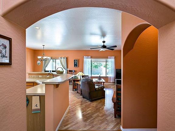 Neil Klein Built, Model Perfect Pronghorn Ranch Home. 3BD/2BA/2GAR, 1731 SqFt, Arch Entry Foyer w/Diagonal Floor Tile & Tile Inlay Leads to Lrg Great Room w/Vaulted Ceilings, Lrg Windows, Tiled Corner Fireplace w/Hearth & Mantle, Art Lighting & Ceiling Fan. Open Kitchen w/Extensive Oak Cabinetry, Laminate Counter w/Beveled Edge, Tiled Backsplash, Dining Island, White Appliances, Gas Stove & Closet Pantry. Master w/Deep Oval Tub, Clear Glass Shower, Dual Sinks & Marble Counter. Diagonal Floor Tile & Wood Laminate Flooring in all the Right Places. Good Sized Guest Bedrooms, Double Chair Rail in BD 2, Warm Paint Tones, Arch Accents & Windows, Sunscreens, Tiled Front Porch, Side Patio, 8' Double Gate, Beautiful Back Yard w/Fruit Trees & Green Vegetation, Covered Rear Patio,