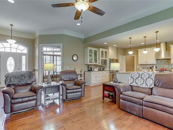 True craftsmanship is evident throughout this 2011 all-brick, custom ranch home! Hardwood floors throughout Foyer, Den, open Great room (w/gas fireplace), Dining, & gourmet Kitchen (boasting lg center island, farmhouse sink, granite counters, gas range w/elec dbl oven, ss hood, built-in microwave & tons of storage in white 42" cabinets & pantry)! Master suite has generous wi closet & private bath featuring wi tiled shower & raised dbl vanity. There are 2 more spacious bedrooms & another full bath w/dbl vanity & tub/shower. You'll also enjoy the 3-car garage, front & back irrigation, security system w/high def cameras, front & back covered porches plus stamped concrete patio w/built-in firepit (gas or wood burning) & gorgeous landscaping!