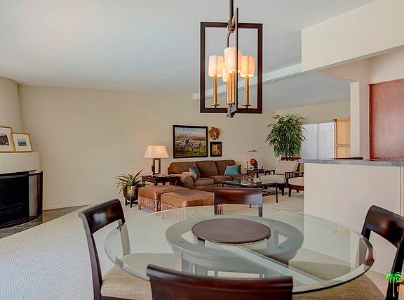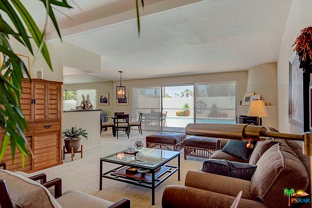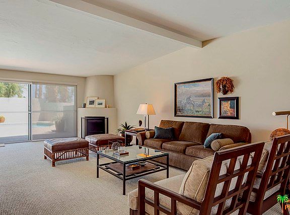 Don't miss this immaculate mid-century home in the highly desirable South Palm Desert neighborhood of Silver Spur Ranch. Enter through the double fluted glass doors into the open concept living room with fireplace, dining area and kitchen you will note all of the many elegant updates. The open kitchen has updated counter tops, beautiful cabinetry and contemporary tile floors. You are sure to appreciate the custom textured walls and ceilings throughout the home as well as the high end designer carpeting. Past the laundry room to the nicely separated bedrooms with mirrored closets that have built in shelves and tastefully updated bathrooms. The bright sunny interior opens to a private backyard for entertaining with a beautiful well maintained pool and new pool pump. This spotless home with water friendly desert landscape is in the community of Silver Spur Ranch, close to the Living Desert and minutes to El Paseo for dining and shopping. FEE land and no HOA's