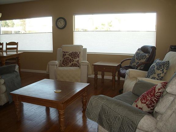 This remodeled well-maintained 2-bedroom 2 bath. Move in ready. Close walking distance to the Club house. Offered turnkey Furnished plus golf cart. Very bright a clean. Partially enclose carport with garage door. Large patio and back yard. 2 sheds. Tri Palm Estates is a 55+ community with many social activities, Low HOA fees allow 2 owners on deed all the golf they can play on our 2 fine Golf courses, Shuffleboard courts, Tennis and pickleball courts, 2 pools, 2 hot tubs, Restaurants and Bar. Close to Costco, Sam's Club, Walmart, Home Depot, Lowe's, And many fine restaurants.