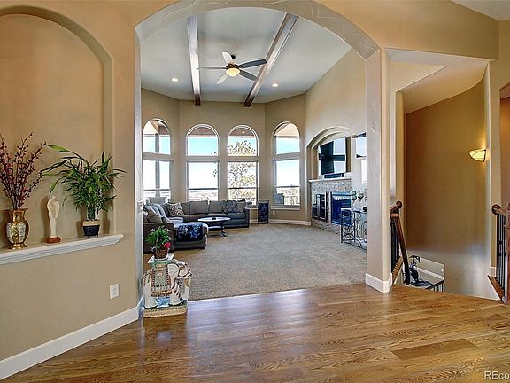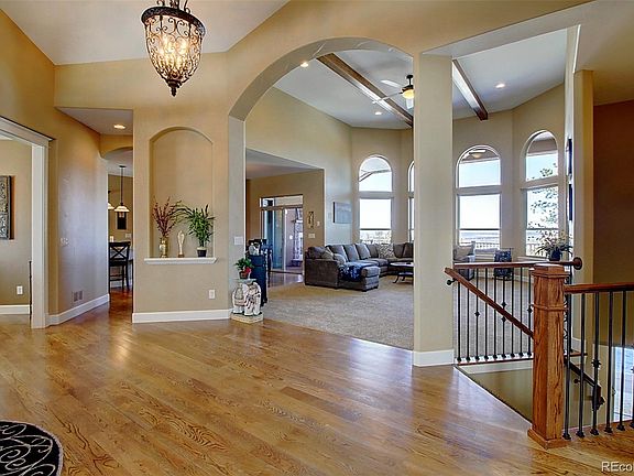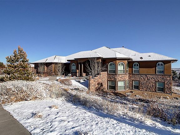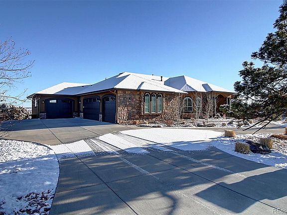BEAUTIFUL custom ranch with magnificent views of Castlewood Canyon on 1 acre lot. Home boasts 10-ft ceilings on the main floor, and custom Norman plantation shutters throughout. Grand entry welcomes you to Great Room with wall of windows, classic Study with built-in bookcases, formal Dining Room, and gourmet eat-in Kitchen with granite-slab countertops, stainless-steel appliances, center island, and large casual dining area that opens to expanded covered back deck with fireplace--perfect for outdoor living and entertaining. 3 Bedrooms on the main level, each en suite. Master Bedroom shares dual-sided fireplace with sitting suite, and features luxury spa-like 5-piece bathroom with his//her closet and private w/d. Partially-finished walkout basement with 9-ft ceilings, 4th bedroom, and full in-law quarters! Fully landscaped front and back yards. New Roof and Furnace. Whole house humidifier. 4-car garage with expanded driveway. Call now to schedule your tour!