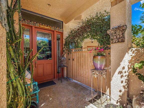 Ironwood Heights community is a secure gated part of Ironwood Country Club just across from the main gate. This home has a private setting with great Eastern mountain views including gorgeous sunrises and the rising moon. The home consists of 3 en-suite bedrooms with additional bedroom/office area connected to a guest suite. Main suite also has a separate office area. 2-car garage plus golf cart area. Enter the home into open wet bar and family room with fireplace just off dining room & kitchen. There is also a sitting/eating area off the kitchen with double doors to pool patio. Gated side driveway wraps around the home with 2-car + golf cart garage. Solar panels are leased @ appox. $265/mo. Ironwood golf, tennis & fitness memberships are available through the Club and separate from home ownership.