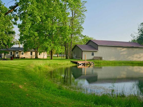 Cute little ranch home on approx. 1.5 acres w/ huge pole barn and large pond with dock. The home is a move in ready ranch w/ an inviting covered front porch, newer paint, laminate and carpet floors, and space to sprawl out. There is plenty of driveway parking and a separate drive to the barn.