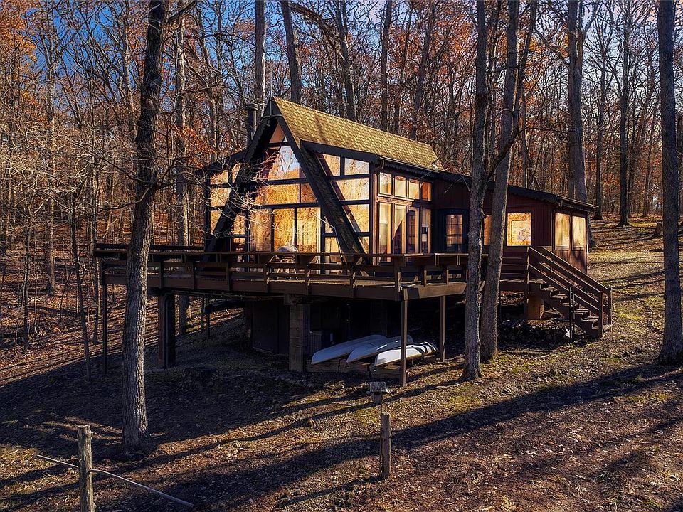 Nestled on a serene 2.43-acre wooded lot, just a short stroll from Seebach Beach and the scenic shores of Lake Aspen, is this beautifully appointed A-frame designed home offers the best of lakeside living at an off-water price. Find soaring vaulted ceilings and walls of windows that create a “treehouse effect” with stunning views! This charming retreat has 2 bedrooms, 2 full baths, and over 1,045 Sqft of living space. Take full advantage of Innsbrook’s amenities including lakes, beaches, golf courses, pools, sports courts, dining, shopping, stables, hiking trails, and popular events like the 4th of July celebration. Additional highlights include a new roof (2023), newer HVAC system, newly renovated 573 Sqft deck with a storage room beneath, wood burning stove, updated LVP floors, expansive circle drive, and is being sold fully furnished including the canoes. Located just 400 yards from Innsbrook’s premier lake, Lake Aspen, in one of Missouri’s most sought-after destinations!