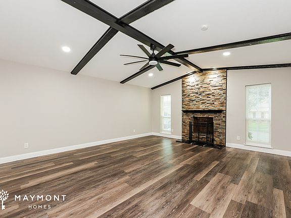 Inside, you'll be welcomed by LVP floors and a spacious living room with vaulted ceilings and dramatic exposed beams. A striking stone mantel serves as the centerpiece of the room, creating the perfect gathering space. The formal dining room impresses with sliding barn doors, a modern chandelier, and windows that fill the space with natural light.