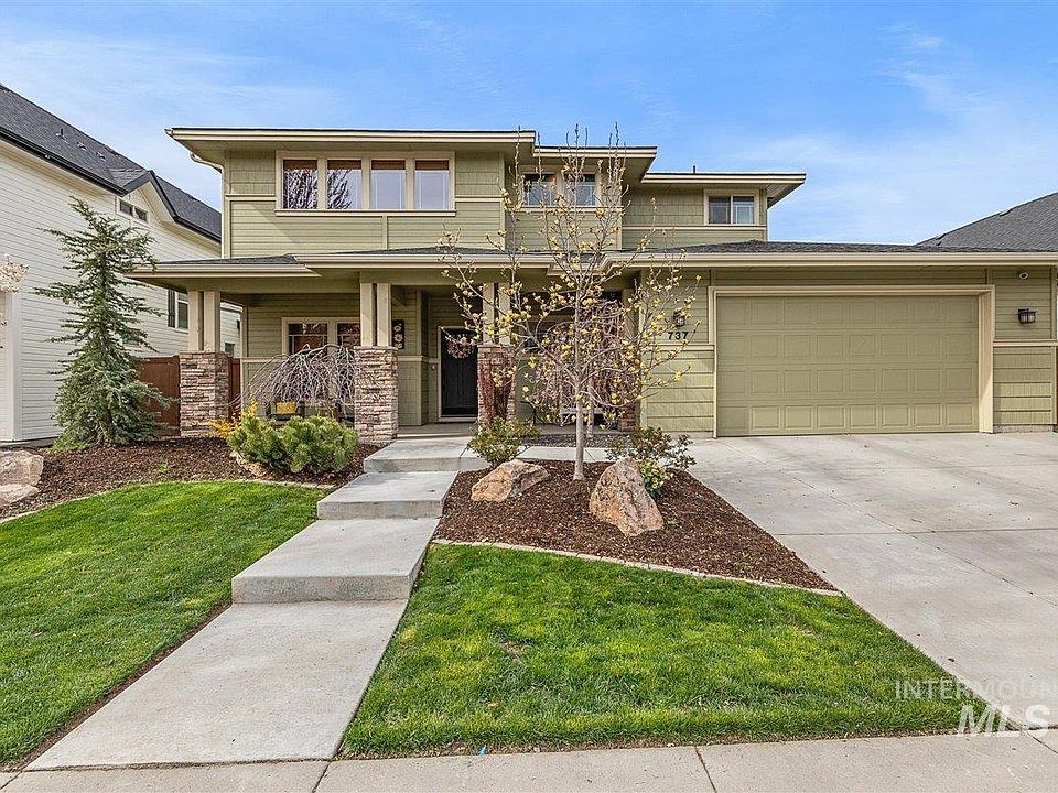 This former Parade Home is MOVE-IN READY in the highly sought after community of Paramount. This one owner home has been meticulously maintained w/ beautiful finishes, craftsmanship & upgrades. Kitchen features quartz counters, gas stove, and SS appliances. Large Primary Bedroom. Spa like Primary Bathroom with large soaker tub, and tiled shower. Bed & full bath on main. Gorgeous hardwood flooring and new carpet downstairs. New LVP flooring in downstairs office/bedroom, upstairs guest bathroom and laundry room. Tons of storage thru-out and extra storage under stairs or kids play space. Tandem 3 car garage. Tankless water heater, water softener, and reverse osmosis filter in kitchen all added in 2020. Exterior painted 2017 and interior 2020. "Dual Zone" HVAC has been serviced every 6 months. 220V plug in garage. Endless fun w/ access to 4 community pools, clubhouse, gym, 5 parks, 2 lakes, and walking paths. Elementary & High School within the community. The Middle School is just across Meridian Rd.