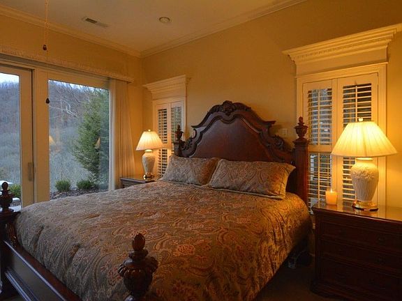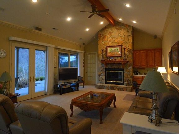 Set apart by its scope, beauty, and privacy, this extraordinary property stretches across 20 acres of idyllic countryside in the famed Smoky Mountains, presiding over a mountaintop realm amid vast rolling woodlands. This one-of-a-kind country estate creates a gathering place for family and friends to enjoy the relaxation and sporting life of this worlds-away natural paradise, glorious in every mountain season. Winding its way through the sylvan landscape, highlighted by a stream running through the property, a paved drive arrives at the mountaintop main residence. As the home's inviting centerpiece, the vaulted living room brings the outdoors in through wall of sliding glass doors.