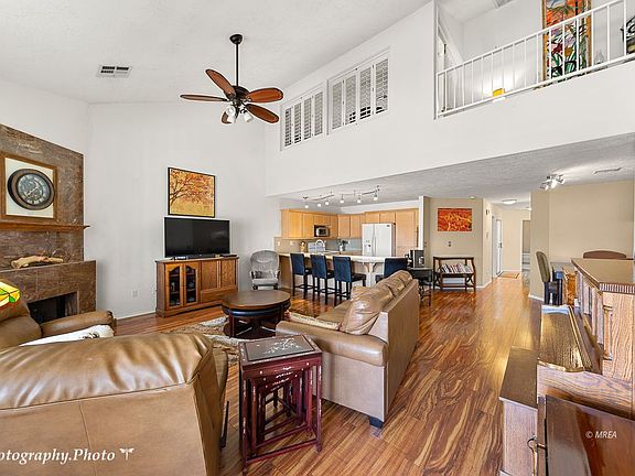 This beautifully updated 2-story townhome sits on an elevated ridge lot. From the atrium off the entryway to the panoramic valley views from the patio, this property has much to offer. Mostly furnished, it features two master bedroom en-suites - one downstairs and an owners' suite upstairs - and a third bedroom that could be used as an office or den. Open concept great room includes a living room with hardwood floors, vaulted ceilings and a custom fireplace, a kitchen with bar seating, Corian counter tops and pendant and under-counter lighting, and a separate dining room area with a much appreciated pantry. The upstairs is all about the owners' suite - truly spacious with upgraded carpet, roman shades and two master closets. The master bath has double vanities, shower plus soaking tub, and a decorative stained glass window. Owners have updated all ceiling fans and all bathroom fixtures & toilets. Extra lighting has been installed in the 2-car garage, along with shelving for storage and a soft water system. The stucco-walled north-facing back patio has a built-in BBQ. Mesa Townhomes has two pools for the residents' enjoyment.