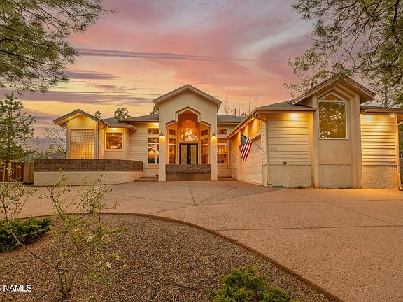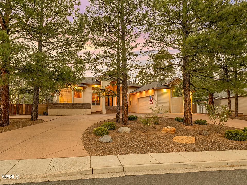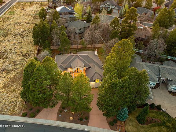 This Amberwood home checks all the boxes, single level, split floor plan, and is surrounded by mature trees in one of Flagstaff's most established neighborhoods. Inside, tall ceilings and oversized windows bring in incredible natural light, while hardwood and travertine flooring elevate the entire home. The layout offers two large living areas, a dedicated office, and a kitchen with custom cabinetry and an eat-in dining space that flows right into the main living areas. The primary suite is tucked away on one side of the home with backyard access, two closets, and an oversized bathroom featuring a soaking tub and separate shower. On the opposite side of the home, two bedrooms with large closets are connected by a Jack and Jill bathroom. Out back, you'll find a generous fenced yard with grass, an RV gate, and an oversized patio, perfect for enjoying all four seasons. With central air, two water heaters, a two-car garage plus a third golf cart entrance from the backyard, and a location that rarely becomes available, this Amberwood property stands out for all the right reasons.