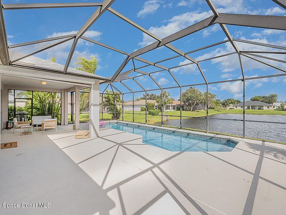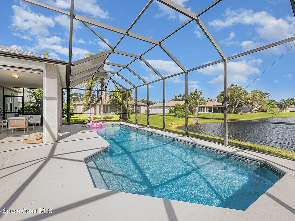 The sparkling blue pool is surrounded by lake views. The covered seating area, complete with roll-down shades, finishes this gorgeous outdoor entertaining area. Perfect for relaxation or hosting gatherings.