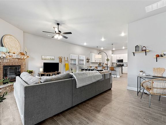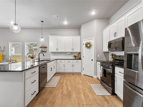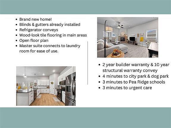 This home here in The Ridge is in pristine condition. The 2 year builders warranty and 5 year structural warranty that transfer will give you even more peace of mind as you settle into your new home. 4 minutes to The City Park and dog park, 3 minutes to Pea Ridge High School and Primary school, and 3 minutes to everyones favorite locally owned coffee spot, Ember Mountain Coffee. Urgent care only 3 minutes away. If you're looking for brand new but don't have time to wait on a new build or don't want to worry about extras like gutters, blinds, appliances...this is it! Home comes equipped with gutters, blinds, a brand new refrigerator. Back of the property is already fenced. The master suite is spacious with a large walk in closet that connects to the laundry room. The laundry room is roomy & has space for adding shelves. The two spare bedrooms are private & separate from the living space and master. Theres still time to be home for the holiday season!