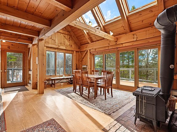 Welcome to your dream home nestled on 46 acres, where the beauty of this Timberpeg post and beam architecture meets the tranquility of nature. This property offers three levels of spacious living, featuring 3 bedrooms and 3 baths. Surrounded by picturesque landscape and long-range views. The open floor plan seamlessly connects the living, dining, and kitchen areas, creating an inviting space for both relaxation and entertainment. Step outside onto the expansive deck, a perfect venue for gatherings and dining, where you can soak in the breathtaking panoramic views. The primary bedroom boasts its own private balcony, offering a personal retreat to savor the sunset or stargaze in the evening. Nature enthusiasts will delight in the property's own network of nature trails that connect to the Vermont State lands of Amity Pond Natural Area. A charming pond adds a touch of serenity, providing a peaceful spot to reflect and unwind. A separate garage with a spacious loft storage area provides ample space for vehicles and storage needs. The pleasant drive to Woodstock and the scenic back roads leading to Silver Lake offer delightful excursions for leisurely afternoons. Embrace the peaceful country setting, explore nature trails, and make lasting memories in this idyllic retreat. Your dream lifestyle awaits in this enchanting haven, where every day feels like a getaway.