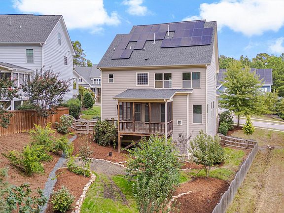 Charming, well-maintained Amberly beauty featuring 4 bedrooms, 2.5 bathrooms, and a spacious walk-up, unfinished plumbed third floor ready for your personal touch. Enjoy the benefits of solar panels and multiple fruit trees in your backyard. The comfortable floorplan includes a main level office, separate dining room, gourmet kitchen with granite countertops and walk-in pantry. REFINSHED Hardwood floors, NEW carpet and fresh interior paint. Relax on the screened porch overlooking the backyard with fruit trees and landscaping. Extensive drainage system in the yard. The extended driveway is convenient for extra cars. Located within walking distance to the Tobacco Trail and a short drive to Jordan Lake. Nestled in a great Amberly neighborhood with a pool and clubhouse. Don't miss out on this GEM!
