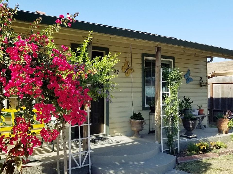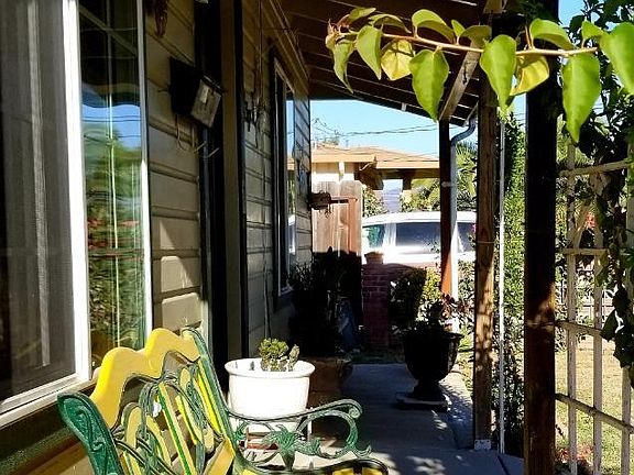 Quite a charming home with a welcoming porch. Shows with pride of ownership. Located 1 block from Cesar Chavez Elementary and close to shopping centers and main roads. Sunny & spacious Livingroom opens up to the dining room and quaint kitchen. Wood floors in all the bedrooms, upgrades and increased living space makes this a perfect starter home & investment. A gardener's shed, fruit trees and a variety of florals & plants frame the lot of this property with red brick fence and manual gates on each side. Move-in ready and a must see!