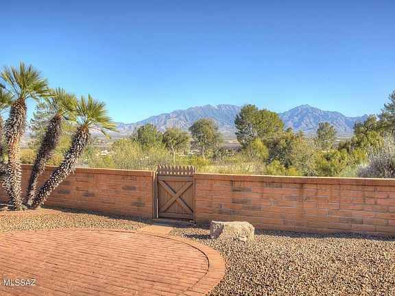 Sitting on a cul de sac overlooking the Santa Rita Mountains, this premium lot will command your attention from the moment you arrive! Backing up to the Desert Hills golf course, this home features unparalleled views of the Santa Rita mountains with no rooftops or homes behind you to interfere with the spectacular beauty beyond! An arched entry leads to the charming front courtyard. Step inside to the wide open living room where large sliders bring the mountain views deep into the interior! A magnificent beehive fireplace anchors and warms the room. The beautifully paved back patio is surely where you will spend most of your time, creating memories with family and friends on warm desert evenings while enjoying the privacy and views. The dining area is adjacent to the living area so guests can continue to enjoy the glowing fireplace and mountains. The recently updated kitchen boasts luxurious maple cabinets and white quartz counters accented with white plantation shutters. A sun drenched breakfast area looks out into the front courtyard and offers an optional dining area for more intimate meals. The large den is open to the living area, or can be closed off when guests arrive. Your primary suite is perfect with a huge walk-in closet, new cabinetry and beautiful walk-in shower with rain glass front. Wake up to mountain views framed by the sliders leading to the patio! A guest suite is down the hallway and has its own private courtyard. If privacy, views and space are on the top of your wish list, this is surely the home you have been looking for!
