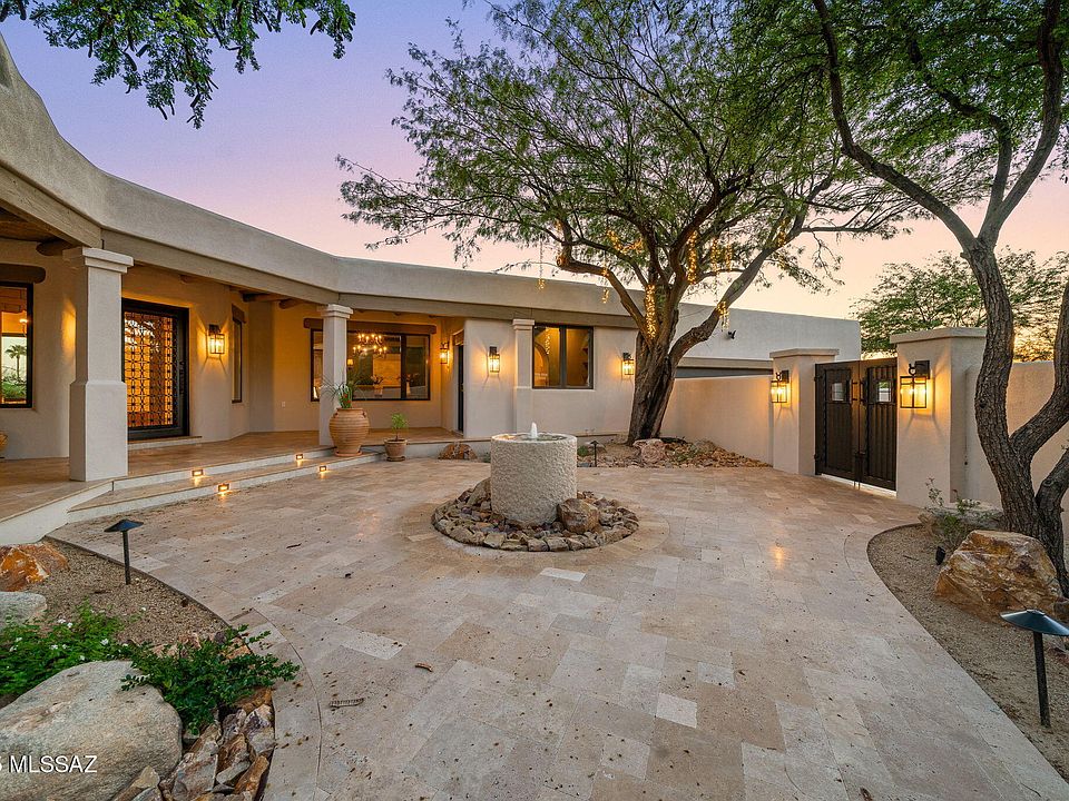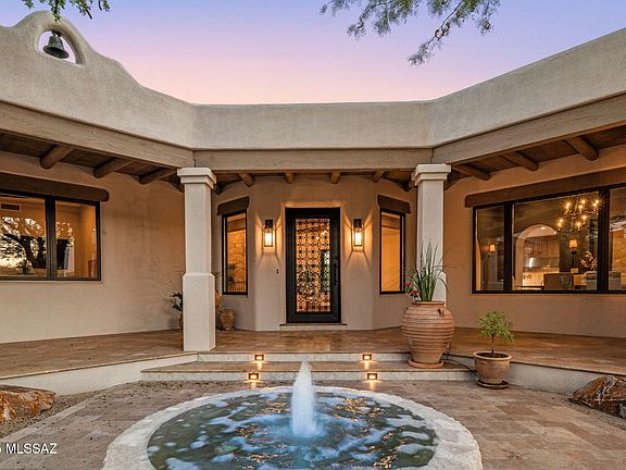 Welcome to Casa Bella Vista in the Catalina Foothills. This modern Santa Barbara style estate is a masterwork of design and detail, showcasing over $2 million in bespoke upgrades. From the moment you arrive, the private courtyard opens to sweeping mountain vistas, blending timeless architecture with refined elegance. Inside, soaring ceilings and walls of glass capture both mountain and city views, while custom Italian finishes, curated materials, and artful craftsmanship create a residence of unparalleled sophistication. The heart of the home centers on a chef's kitchen with professional appliances and seamless flow into expansive living and dining areas. Five bedrooms and four and a half spa-inspired baths provide privacy and comfort, while the primary suite offers a true retreat with breathtaking views and a sanctuary-like bath. Outdoors, resort-style living unfolds. A shimmering pool is set against the backdrop of glittering city lights, framed by lush turf, mature trees, and multiple entertaining terraces. Two covered patios, including a fully appointed outdoor kitchen invite year-round gatherings, while the elevated setting delivers vistas few can rival. Every element of this estate was designed to inspire, indulge, and impress.
