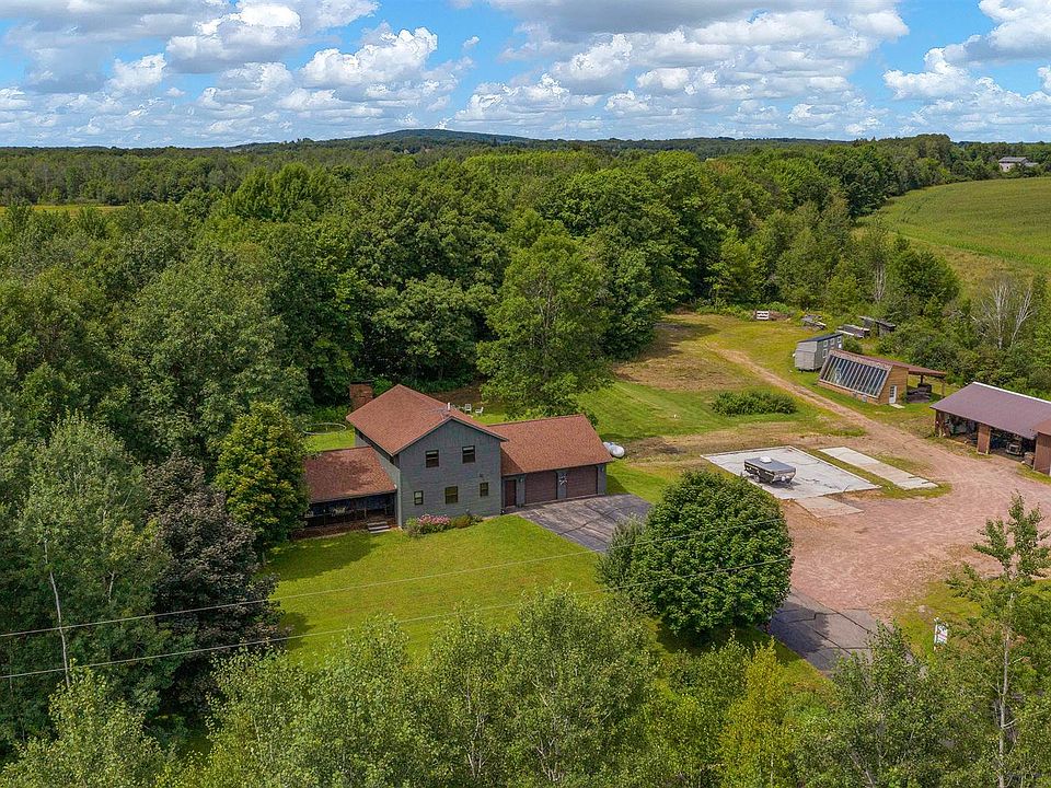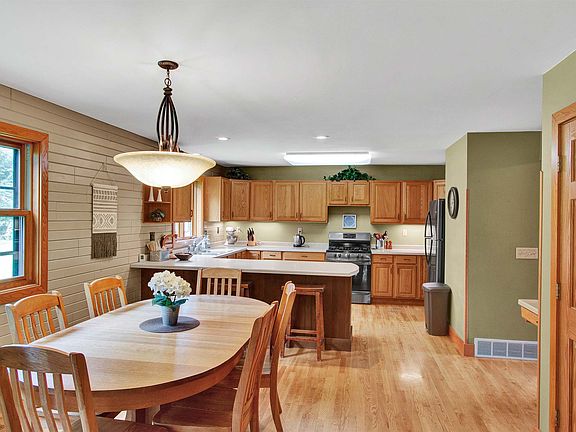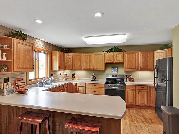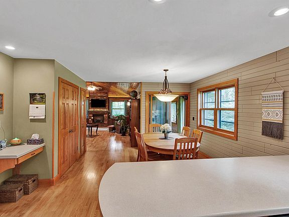 Pride of ownership certainly shows in this one-owner home! With the home featuring 4 - 5 bedrooms and approximately 6 acres of land, there is plenty of room for the family to spread out both inside and out. Main floor features a spacious kitchen, dining room, living room with vaulted ceiling and fireplace, bedroom/office, laundry room with full bath, a mud room as you come in from the garage and a beautiful 4 season room which leads to the back yard. Upper level offers 4 large bedrooms and full bath. Basement features an L-shaped family room, bonus room that would work well for an office, kitchenette area and full bath, plus an unfinished portion for storage and the mechanicals. All of the wood work and flooring inside this home have been hand crafted by the owners. Outside you'll find an inviting covered front porch, 2 stall attached garage, a 30x48 pole building with an additional 30x40 open sided pole building attached to that, plus a greenhouse that could have multiple other uses. Enjoy all that nature has to offer by taking a walk on the trails or simply sitting by the pond.