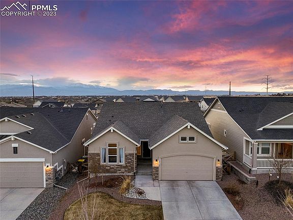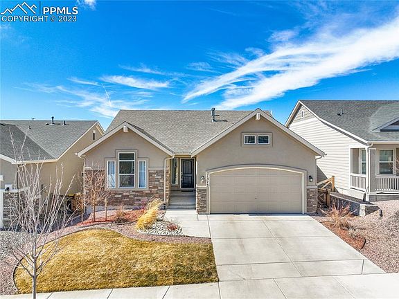 Welcome to one of Classic Homes' most desirable ranch floorplans located in the heart of one of the most prestigious communities, Banning Lewis Ranch. This community has something for everyone from its many parks, the club house with fitness center, pools, water park, hiking trails, dog park, schools, and so much more! From the moment you pull into this community, you'll understand why people flock to this area. The home is equally as impressive with its beautiful stucco and stone exterior, it's tall ceilings throughout the main level, wood laminate flooring, custom tile work, and the many windows that allows in lots of natural light and spectacular mountain views from the kitchen! This open concept floorplan is perfect for entertaining as the family room opens up nicely to a spacious kitchen. The kitchen boosts 42 inch white cabinets, stainless steel appliances, quartz countertops, a large center island, a custom backsplash, and bonus pantry. The master bedroom is conveniently located on the main level and offers an adjoining bathroom with an oversized shower, double vanity, and beautiful gray, quartz countertops. There is an additional bedroom and full bathroom on the main level as well. Head downstairs where you'll find a spacious additional family room that offers endless opportunities. There are another two large bedrooms and a full bathroom downstairs. And if your heart desires, you can add a 5th bedroom to this home with the bonus storage space! The backyard is another great feature of this home as is offers a large custom stone and concrete patio with a yard perfect for games or gardening. The garage offers plenty of additional storage, epoxy floors, and an additional 220v/50amp perfect for charging vehicles. With this well thought out design plan and beautiful features throughout, this home is sure to impress!