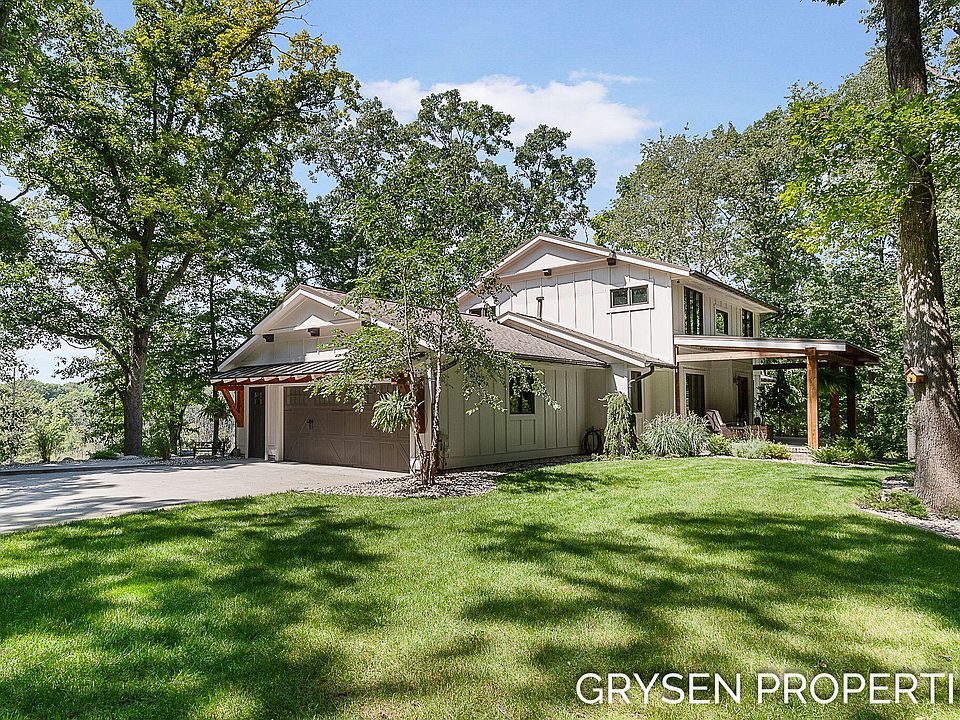 Discover your dream home in this exquisite 2-story Craftsman-style residence, nestled on 9 sprawling acres on the scenic Thornapple River. This stunning property offers 5 bedrooms, 3.5 bathrooms, and quality finishes throughout. The main floor features a luxurious primary bedroom suite, providing a retreat with ample space, walk-in closet, private balcony, and an ensuite bathroom. The open-concept living area is perfect for entertaining, with a gourmet kitchen that flows seamlessly into the dining and family rooms. Upstairs, you'll find 3 bedrooms and a beautiful full bathroom, ready for family call home. The lower level brings even more entertaining spaces hosting a recreation room with a spacious bar. The location is prime; just 5 miles from M6, near the airport, and various amenities. Expansive windows throughout the home allow for abundant natural light and breathtaking views of the surrounding landscape. Finishes such as hardwood cherry floors, three tiled showers, and solid core doors; this home was carefully curated.
