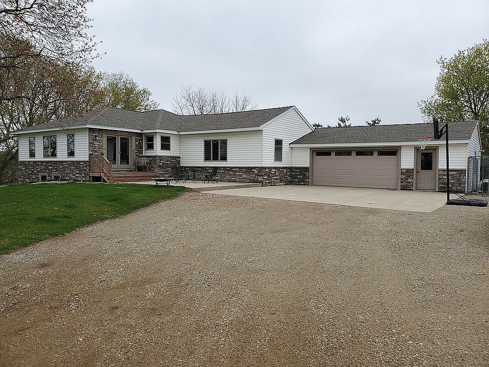 This 4 bedroom, 2 bath ranch has been fully remodeled and sits on 3.4 acres located on the Minnesota/ Iowa border with beautiful country views in all directions. The 1882 sq ft main floor includes an open floor plan with a spacious kitchen, dining, and great room; a 22x21 ft lodge-style family room with a fireplace and vaulted ceiling; 2 bedrooms, full bath, main floor laundry, and custom hickory trim throughout. The fully remodeled 1400 sq ft walk-out basement includes 2 bedrooms, full bath, and an additional living room. This hilltop acreage also includes an attached 24x30 ft heated garage, a 40x80 ft shed with concrete floors, & available pasture for horses.