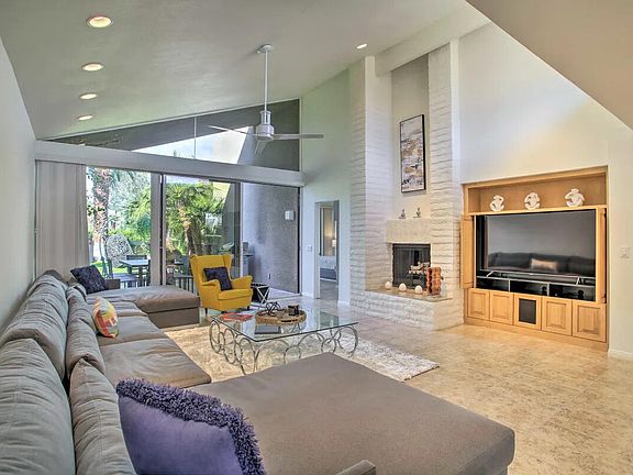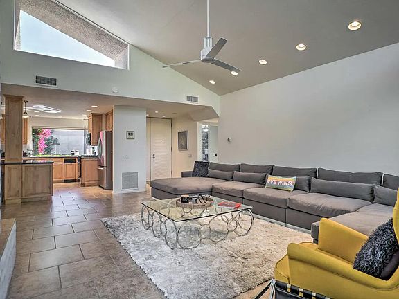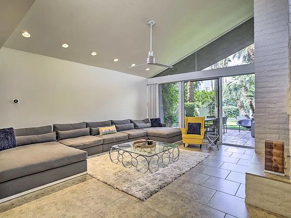 Find serenity at this Palm Desert short term vacation rental in Shadow Mountain Resort - located just two blocks from EL PASEO shopping & dining. Unbeatable location, one of the nicest condos you'll find. Stylish & spacious VILLA features 3 bedrooms, 2 bathrooms and affords 1,831 sq. ft. of living space w/ a big backyard and covered patio. Vaulted ceilings with large celestial windows and solar tubes provide ample natural light. Each bedroom has a private a patio and a 4th patio off the dining room. The kitchen is updated w/ granite counters, newer cabinets, island w/ breakfast bar, newer stainless steel appliances, new blinds, and solar tubes in the ceiling. Recent updates include, new blinds throughout, fresh paint, new laminate floors in the bedrooms, tankless water heater, and a brand new AC unit. Villa has a detached, enclosed garage with 2 parking spots. Access to three pools, four spas; one conveniently located across from the villa. Just a few blocks from the Shadow Mountain Golf Club. Guests may access club amenities, including golf and tennis by purchasing a membership or pay daily rates. Don't miss this incredible opportunity to own a highly successful STR walking distance to EL PASEO!