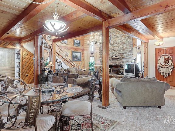One of a kind ACREAGE property in beautiful Sweet! Custom log home w/ 4-car garage/shop, several outbuildings, walk-in cooler. Bring your animals! Fenced area is currently home to Horses & goats! Natural spring on property. Wrap around porch perfect place to take in beauty of surrounding scenery. Interior boasts floor to ceiling rock fireplace, exposed beams, lots of custom woodwork, large food storage area. Upstairs has recently been updated with 2 new full bedrooms. Don't miss this great opportunity!