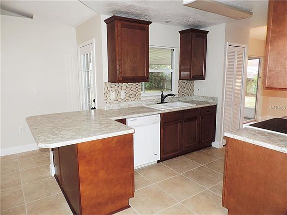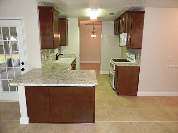 Beautifully renovated home with new roof, garage door and exterior paint. The inside has been completely remodeled from top to bottom with 20'' porcelain tile, new carpet and fresh paint. Kitchen has new cabinets w/ crown molding, new counter tops, and appliances with double oven. Bath rooms have been retiled and new vanities with granite tops. Large covered screened in patio overlooks backyard with fenced in yard and mature landscaping. Walking distance to Atlantis Elementary school. This home wont disappoint.