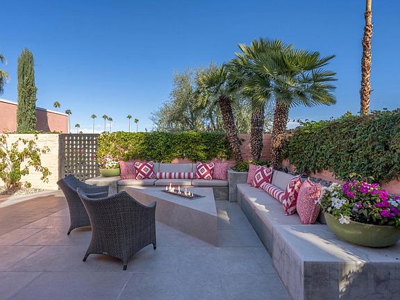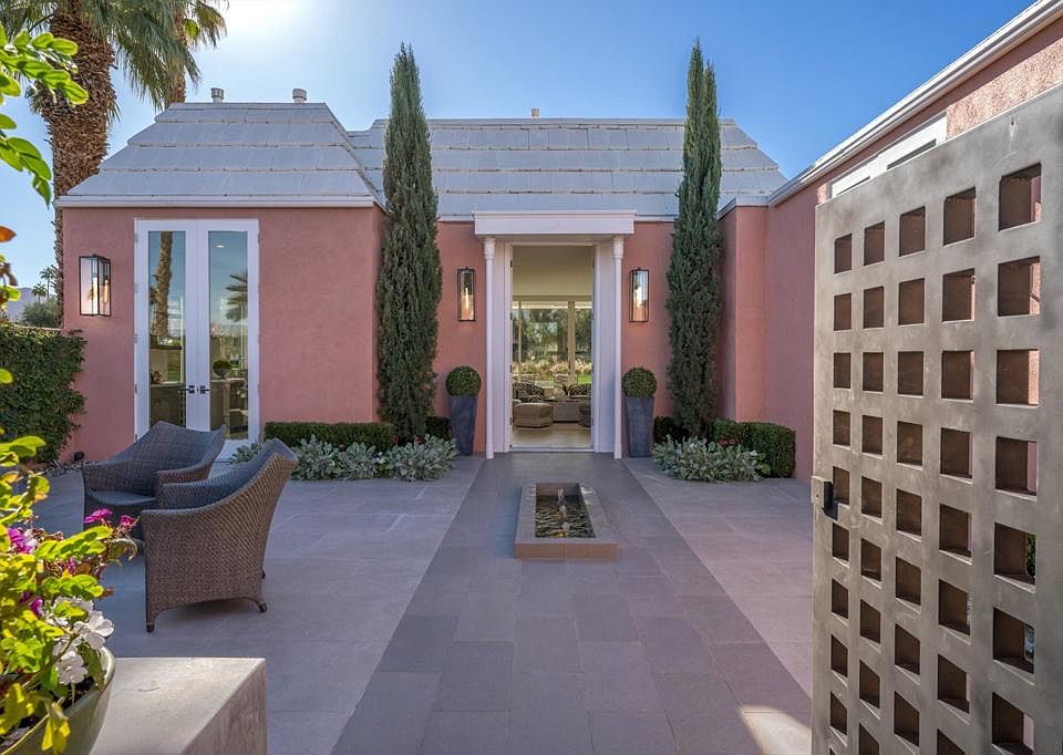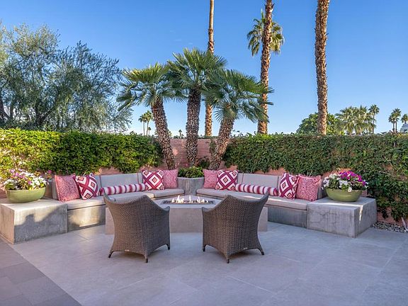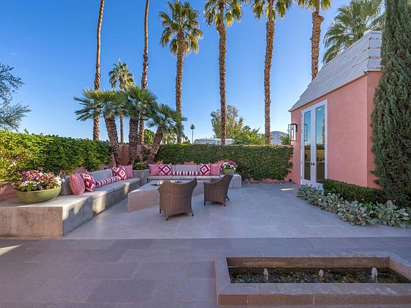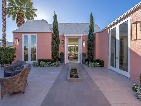 Modern and effortlessly sophisticated, this exquisite Hollywood Regency home redefines luxury of the country club living. From the moment you arrive, the grand front courtyard invites you into a world of elegance with its custom fountain, firepit, and built-in seating, all artfully illuminated by landscape lighting. Meticulously reimagined in 2018, every inch of this home exudes perfection. 24''x48'' Italian engineered stone tiles and a chic Linear Montigo fireplace elevate the interiors, while expansive living spaces flow seamlessly onto terraces for ultimate indoor-outdoor lifestyle. The galley-style kitchen is a masterpiece, featuring sleek Luxe cabinetry, quartz countertops and a custom drinks bar complete with a wine fridge. Opening directly to the courtyard, it ensures seamless entertaining with effortless style. Dining area boasts a breathtaking view of Mt. Eisenhower through a custom-designed window. Primary suite is a private sanctuary with a spacious walk-in closet and a magazine-worthy bathroom featuring a floating dual vanity, oval soaking tub and an oversized glass shower. Guest suite exudes comfort, complete with a generous sitting area. Additional enhancements include all-new interior and exterior doors and windows, motorized window coverings, a retractable terrace awning, new electrical and plumbing systems, integrated sound system, and a new HVAC system. Offered turnkey furnished, this remarkable residence embodies modern elegance and high-end desert living.