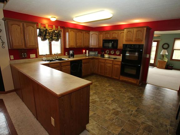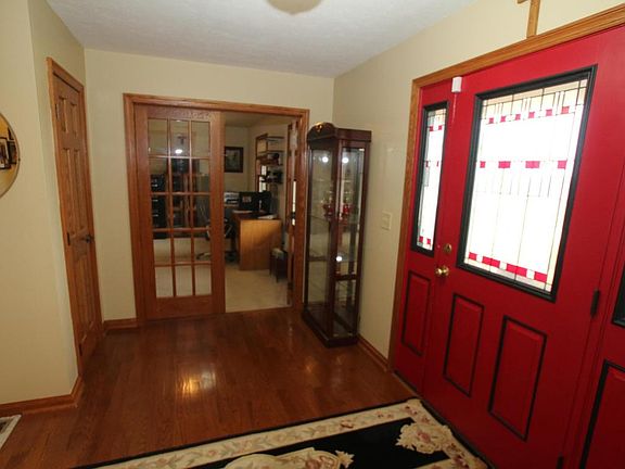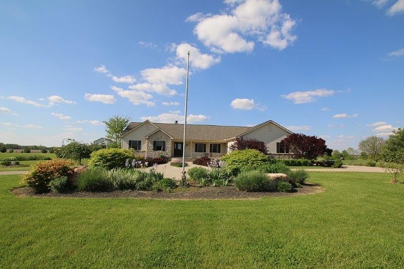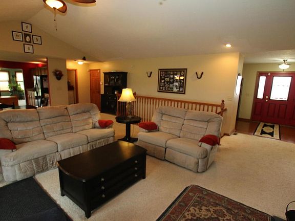 Great floor plan. Very open concept. 3/4 oval concrete (partial stamped) driveway. Two front bedrooms have been used by current owner as home offices. All they would need is closets.Kitchen, dining lead to a huge (21'2'' x 16') Great room (all cathedral ceilings) with stone front wood burning fireplace. Six panel solid oak doors and trim throughout. Generac generator is for back up energy. Lower level has dry wall and recessed lighting in finished ceilings, Trim is on site (oak) A half bath (dry wall for shower) to make a full bath. Potential of another living quarters. (roughed in for kitchen also) Lower level is another approx. 1500 square feet. Great room TV and wall bracket and kitchen / dining room drapes do not convey. Plenty of room to grow in this home sitting on 5 acres,