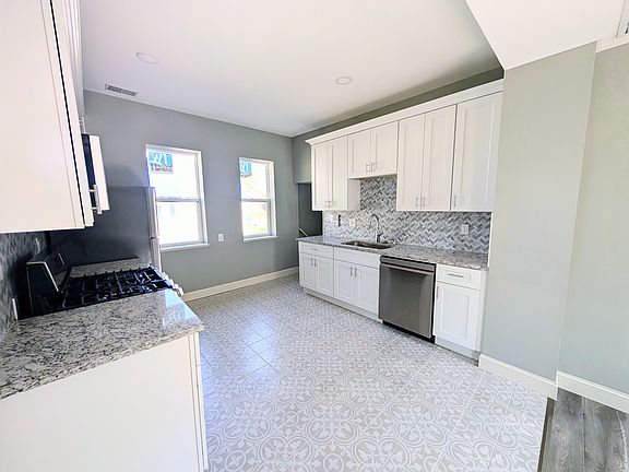 The gourmet kitchen is a chef's delight, boasting brand-new, solid-ply cabinetry with soft-close drawers, elegant granite countertops, and a luxurious marble tile backsplash. A full suite of stainless steel appliances, including a refrigerator, stove, dishwasher, and microwave, completes this high-end space.