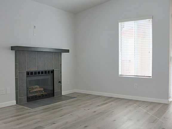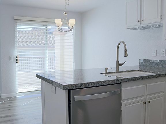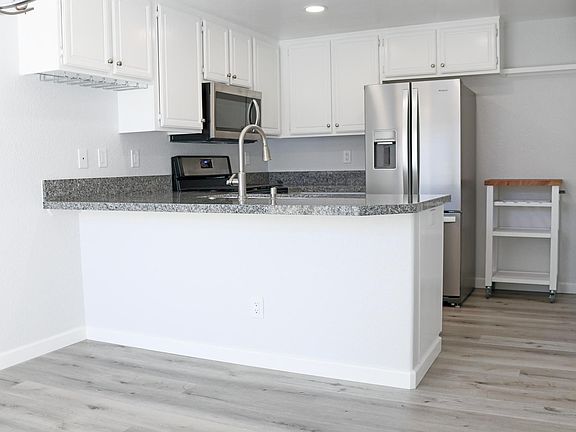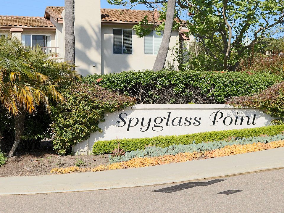 Gorgeous freshly remodeled end unit soaked with natural sunlight in desirable Spyglass Point. New luxury vinyl plank flooring, granite counters with eat up bar and all new appliances in kitchen. Dining area opens to large sunny porch. Open living room with fireplace with custom tile surround. Spacious master bedroom with full length mirrored wardrobe and full height vanity with granite counter. New A/C and in unit stacked laundry with cute barn door. Detached one car garage with bonus storage room and additional covered parking space. Community pool / spa, gym and BBQ area. Owner pays for water and trash/recycling. Tenant responsible for SDGE.