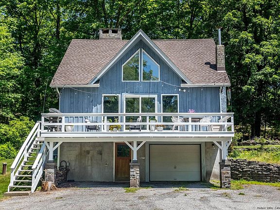 Welcome to the “O-hay Chalet.” This contemporary chalet sits on three peaceful acres, just minutes from the shops & restaurants of Woodstock. Step onto the oversized deck, and you’ll be greeted by the sounds of the stream that overlooks the landscaped grounds, fire pit, and flower garden. The home’s spacious, open floor plan seamlessly connects the living, dining, and kitchen areas, creating an ideal space for entertaining and relaxing. The wooden beams, reclaimed barn wood, impressive bluestone fireplace, and Jotul wood stove provide warmth and charm. The space features three well-appointed bedrooms with custom closet systems and two full baths, including a custom tile mural by Alison Eden Studios and a Restoration Hardware vanity. The kitchen features quartz countertops, custom walnut cabinets, and updated stainless steel appliances. The property also features a drive-under garage and 600 square feet of unfinished space with lots of potential. Completely turnkey, the chalet also has many modern updates: central air and forced heat, a whole home UV light water filtration system, new water heater and well pump, Nest Protect & wifi enabled thermostat, new roof (2017), updated electrical and an EV charging outlet. With its central location and easy access to the towns of Woodstock, Kingston, Phoenicia, and more, you’ll be minutes to shopping, dining and entertainment, and countless outdoor activities. Whether exploring the nearby Ashokan Rail Trail, fishing at Onteora Lake, or simply enjoying the serenity of the stream in your backyard, you have the best of the Catskills at your fingertips. Take advantage of this extraordinary opportunity to own a piece of paradise on the iconic Ohayo Mountain Road.