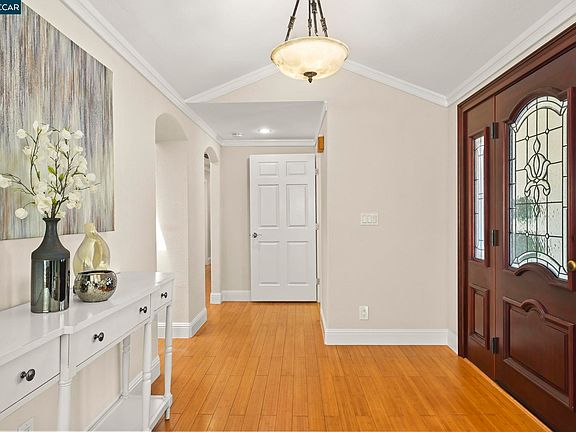 Here's the "Scottsdale" model, the largest plan of the 4 Country Manors in Crow Canyon Country Club a 24hr gated Community. Extremely quiet and Private location, backing to “Open Space”. Highly remodeled starting with a Custom Leaded-Glass Front Door and matching leaded-Glass sidelights, Kitchen with white shaker cabinets, gas range and granite slab counters, all 3 bathrooms (1/2 bathroom was expanded to a full bathroom), raised ceiling in Living Room with upgraded glass slider doors out to backyard, many added can lights, surround speakers installed in Family Room & Living Room ceilings, dozens of can lights added, Oversized Wet Bar with granite slab and bar seating for 8 people, sheetrock with newer finish inc. all radius corners, Lots of Crown Molding, Fresh interior paint, Bambo Hardwood flooring throughout most of the home, Plantation Shutters, newer roof with (7) skylights added & (3) natural light "Sun Tubes" lights added, garage has EV charging station, many built-in cabinets, textured & painted walls & ceiling, epoxied floor and pull down attic storage. The atrium was enclosed increasing square footage from 2,137 to 2,268. One of the 6 community pools is conveniently located at the end of Paradise Valley Ct S. Just a short walk to the Country Club… Welcome Home!