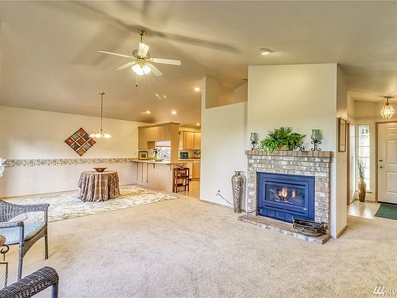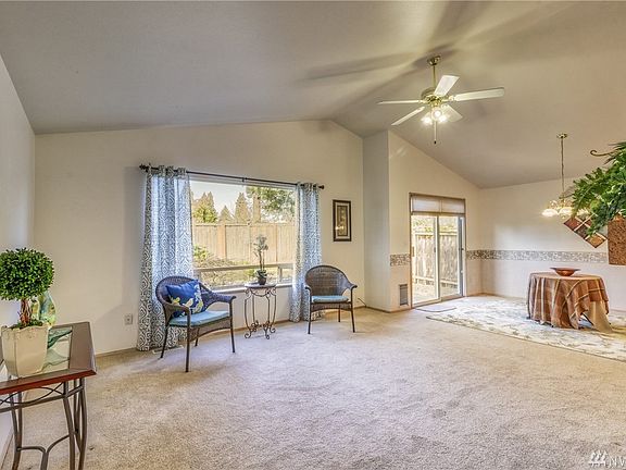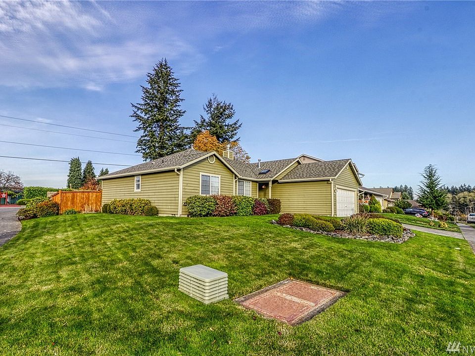 Great Tumwater neighborhood! Rambler with desirable floor plan on corner lot with easy to maintain private back yard with patio and utility shed. Hardwood entry, newer carpet, vaulted ceiling and skylights. Great-room concept with family and dining room combination, open for entertaining and a gas fireplace. Master suite has a walk-in shower and dressing area. Front yard has an in-ground sprinkler system . Gas forced air and hot water.