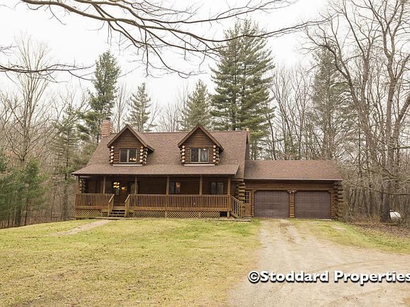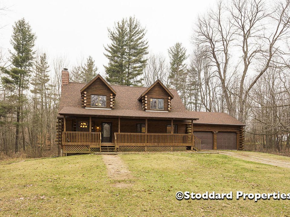 This beautiful log home sits on close to 20 acres. Driveway is secluded and curves to open up to the front of the property. The home features beautiful scenic views on a wooded lot with a ton of privacy. The master is located on the main floor with attached master bath,sliders open up tot he back deck. Main floor also includes open floor plan and sky lights for great natural light. The loft on second floor overlooks the entrance, living room, dinning room, and kitchen. There is a room right off garage that would be perfect for an at home office.