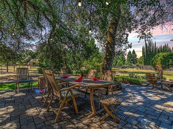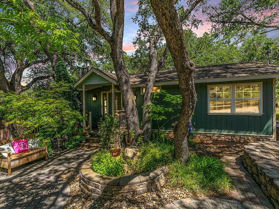 Welcome to this beautiful home on a usable acre in an enchanting setting with shade trees and lush landscaping. Professionally laid pavers lead to a detached 2-car garage and extra parking. Inside, a welcoming slate entry complements the slate-surround wood-burning stove. Crown molding and waterproof laminate flooring create a seamless flow in the great room. The kitchen, an entertainer's delight, features abundant cabinets, recessed and pendant lighting, leathered granite tops, and stainless-steel appliances, including a refrigerator. The charming dining/breakfast nook has deck access, offering a park-like setting. Enjoy picturesque views from every window! The home includes an inside laundry closet, newer water heater, and high-speed internet. The beautifully landscaped yard is perfect for entertaining, with patio furniture and a firepit. A separate fenced area is ideal for chickens, livestock, or pets, with room for a pool, shop, and all your toys. Two spacious storage sheds (approx. 8x12 and 8x10) ideal for the gardener and hobbyists. Buyers to assume the solar PPA, $125/mo. NEM1 rates transferable. Home is All Electric. This beautiful property is one-of-a-kind with a serene and private setting. Come see and feel for yourself, you'll Love where you Live!