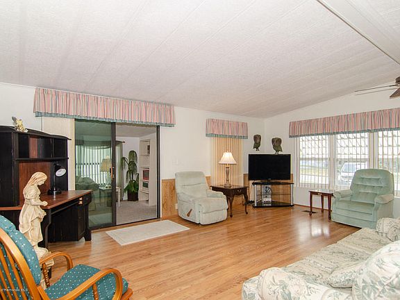 MUST SEE!! This is a BEAUTIFULLY MAINTAINED, mostly furnished, GOLF COURSE HOME! This lovely 2/2 home is light & bright with laminate floors, cathedral ceilings, DOUBLE PANE WINDOWS, newer appliances, and UPDATED KITCHEN with real wood cabinets. This home offers handicapped access with a motorized wheelchair lift. LARGE this home has great curb appeal with a landscaped yard, vinyl siding, and a CIRCULAR DRIVEWAY with room for four cars. NEW ROOF in 2011! Large utility room and golf cart storage.Located in popular 55+ community where you own your own land. Community amenities include tennis, heated pool, horseshoes, bocce, community center, pickle ball and more. Located near major medical facilities, shopping and restaurants.