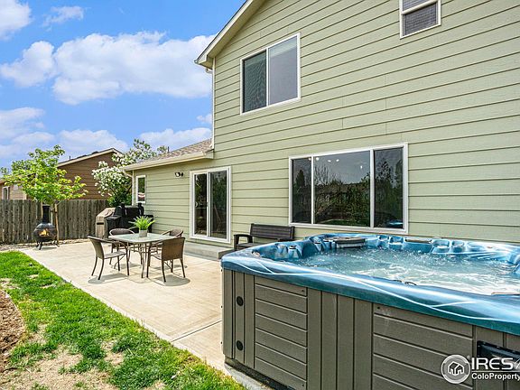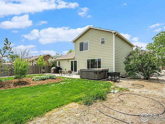 Finally a HUGE back yard for gardening, entertaining & fun! Are you looking for a little space between you and your neighbors? This neighborhood boasts some of the largest lots in Wellington and this home features almost a 1/4 of an acre, fully fenced & landscaped with lots of trees, complete garden shed, huge patio & hot tub included! The house is light & bright with hardwood floors throughout most of the home. New roof, brand new paint & lighting, and almost all of the windows are new. Open floor plan with vaulted ceilings and spacious living areas. Upper level features a primary suite with 3/4 bath and large walk-in closet and two spacious guest bedrooms. Full unfinished basement for future expansion. 3 gar garage with 220v outlet & 15+ electrical outlets. Great west-facing orientation keeps the huge back patio shady for summer afternoon fun. Clean and move in ready with a 14 month home warranty included.