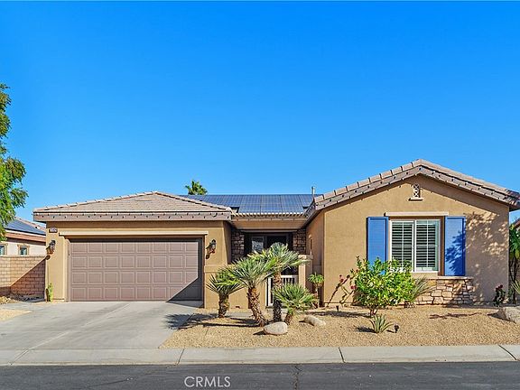 Beautifully maintained home in The Gallery in Palm Desert. This 3 bedroom, 2.5 bath home shows like a model. Recently painted, and remodeled baths. New shutters, blinds and carpet. Owners recently purchased solar. Insulated attic, and solar screens contribute to the low cost of less than $53.00 per month for all utilities. The open floor plan allows for seamless living. The kitchen has an abundance of cabinets with granite counter tops, an island with sink, and recently updated stainless steel appliances. With access from the kitchen, the backyard is ideal for entertaining. Serene mountain views and the ambiance of the pebble tec pool and spa, covered patio with misting system, built-in fire pit table, artificial grass, and a high-end BBQ island equipped with a beverage refrigerator, sink & sitting area are perfect for entertaining your guests. The primary suite has access to the backyard, a walk-in closet and a private bath that includes, dual sinks, oval tub, and separate walk-in shower. Other features include; tile flooring, high ceilings, crown molding, gas fireplace, whole house water filter system, tankless water heater. Jandy pool and outdoor area system that controls pool, spa, misters and outdoor lighting. Oversized 2-car garage with an epoxy floor and Level 2 EV charger.
