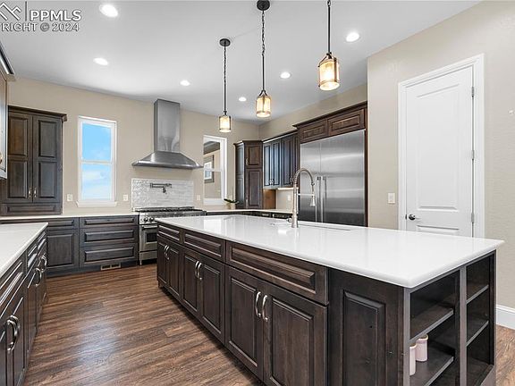 This breathtaking property spans 82 acres of rolling fields, offering spectacular views of the Rocky Mountains. The land is fully fenced and features three expansive pastures perfect for cattle, horses, or bison. The property includes a 4,000 sq ft outbuilding with a reinforced concrete floor, 14’ power door, separate electricity, and pre-plumbing. Additional structures include a lean-to, a Quonset, and a tack shed. Water resources are ample, with substantial water shares included. A 1,000-gallon buried propane tank ensures reliable energy. A comprehensive floodlighting system allows you to illuminate every corner of the estate at the flip of a switch. This custom-built ranch home features nearly 8,000 sq ft of exquisitely finished living space. The home features six bedrooms, including two master suites, ideal for generational living. The main floor master suite has direct access to the expansive deck and includes a coffee bar, offering stunning views of Pikes Peak. The suite features a spacious walk-in closet with ample storage and an island, and an en suite bathroom with separate prep areas, a luxurious tub, and a walk-in shower. The main floor also has two additional bedrooms, each with its own bathroom. The gourmet kitchen is equipped with top-of-the-line appliances, quartz countertops, and a Butler’s pantry. The walkout basement is filled with natural light and offers beautiful patio access and great views. This level features an additional living area with a full wet bar, refrigerator, and dishwasher. There are two more bedrooms on this level, including an optional second master suite. Additionally, you'll find a fitness room and a concrete-reinforced, ventilated safe room ready for your customization. Convenient laundry rooms are located on both floors. Don’t miss the opportunity to make this extraordinary property your own. Please make an appointment before stopping by as this home is owner occupied!