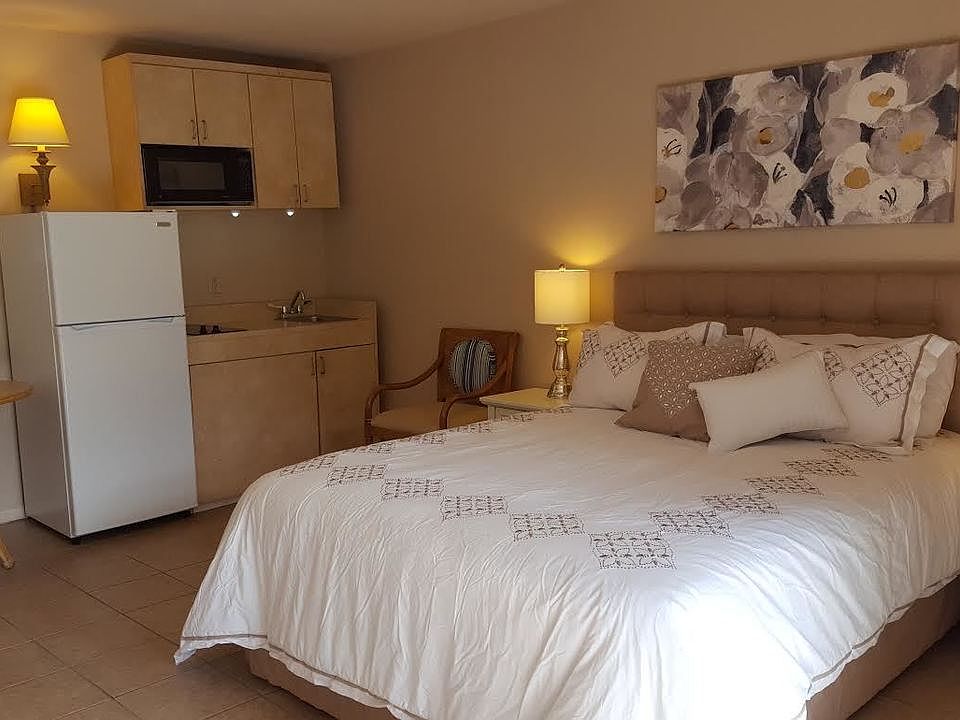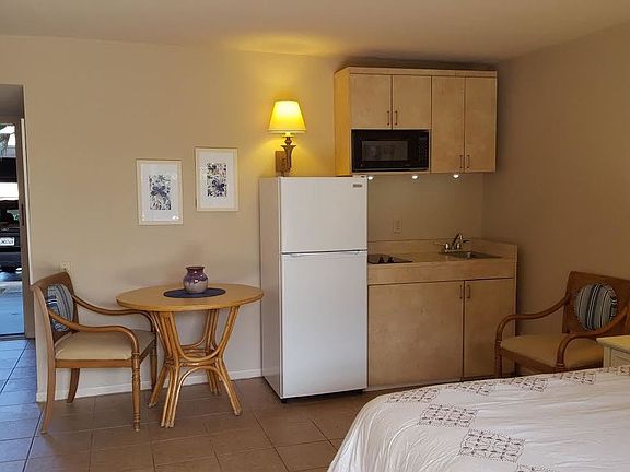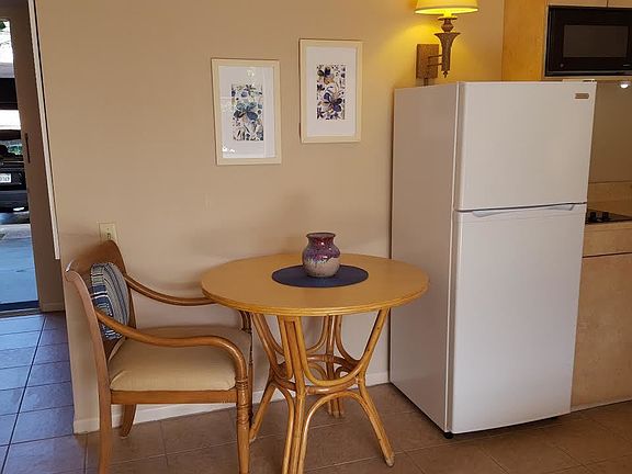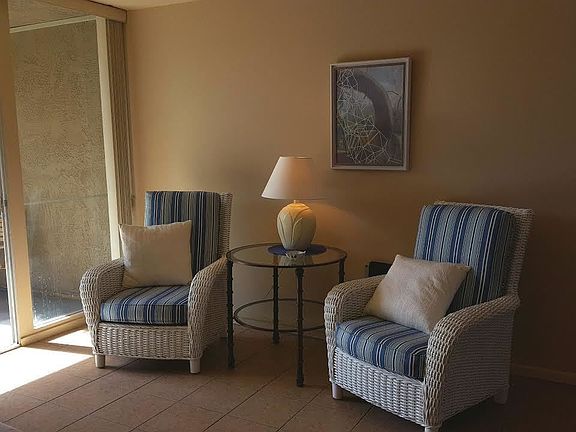 This beautiful studio is the perfect getaway or vacation rental! Sold turnkey furnished, remodeled bath with granite counters, dual sinks and beautiful walk in shower and kitchen with cooktop/microwave and refrigerator. Sunny patio has view of golfcourse and mountains and is just steps from one of 3 HOA pools/spas. All in a beautiful location! Quarterly HOAs cover ALL UTILITIES and BASIC CABLE!!! This studio also comes with a covered carport. Enjoy tennis, swimming, golf or dining and shopping on El Paseo!