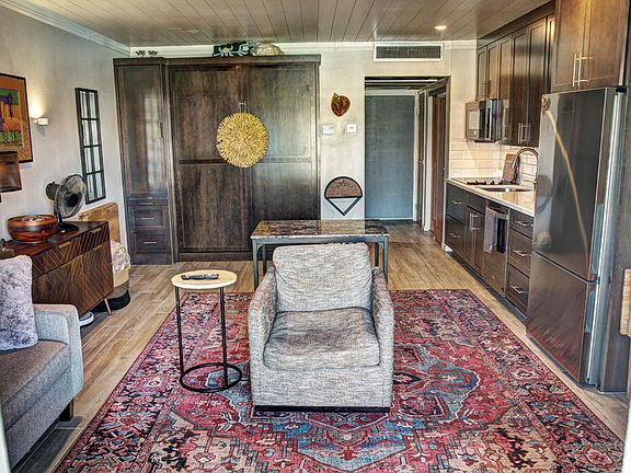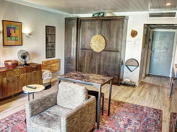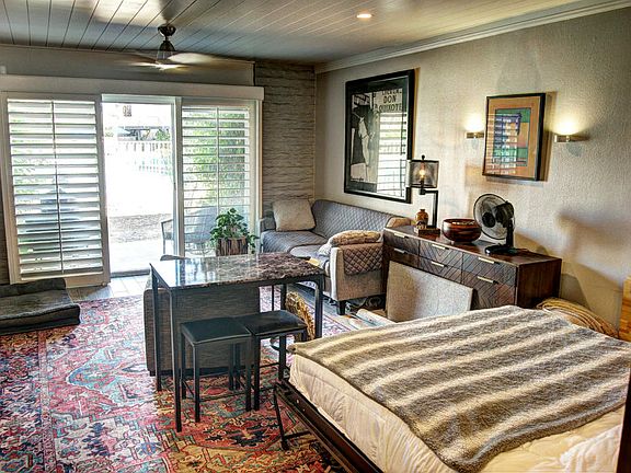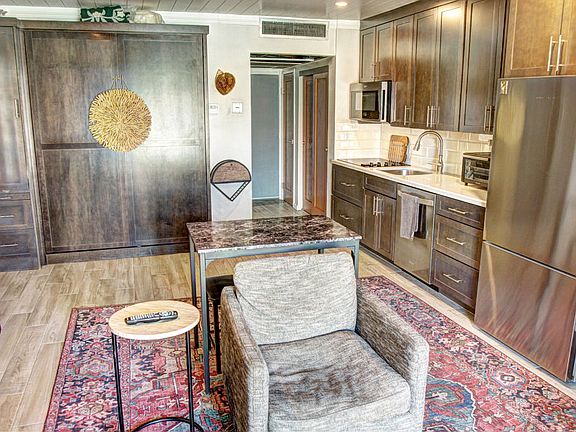 One of the nicest remodeled studios ever in Shadow Mountain Resort. This large poolside unit has a clean, modern look and is complete with Murphy Bed, TinG Shiplapp ceiling, ceiling fan, KraftMaid cabinets, custom lighting and full size appliances. The furniture stays. Shadow Mountain Resort is one of the few opportunities to own a Short Term Rental property in Palm Desert. Owner can use the unit when they want and generate income when they are away or occupy full time - many residents do! The adjacent Resort boasts a World Famous Tennis facility with pickleball courts, fitness center and a large, resort pool as just some of the Resort amenities - use of Shadow Mountain Resort amenities requires a separate membership. The Resort is also next door to historically significant Shadow Mountain Golf Course. HOA dues include ALL utilities paid, including electricity, cable tv, and internet as well as 3 HOA pools and spas. All exterior maintenance and building insurance is included. The location is unbeatable in South Palm Desert and you can walk to El Paseo! Resort Membership information can be seen at https://shadowmountainresort.com/palm-desert-resort/resort-memberships/