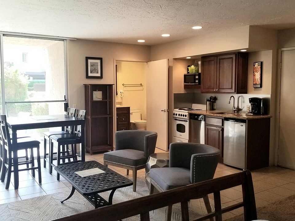 Creekside enjoyment at Shadow Mountain Resort! This beautifully remodeled and spacious studio is perfect for a relaxing getaway or vacation rental property. It is an end unit with a nearby covered carport. Newly furnished with 2 queen size beds, dining area, livingroom and a full kitchen. Patio is right off of the tranquil and soothing creek that runs the length of the building. The quarterly HOA fee of $1,232.09 INCLUDES ALL UTILITIES (electricity, water, sewer, trash and basic cable). There are 3 HOA pools/spas located throughout the complex to enjoy. The main pool, tennis, fitness center and pro shop require annual membership fee. Shadow Mountain Resort....the gem of South Palm Desert is located close to El Paseo for dining, shopping and entertainment. Come enjoy all that Shadow Mountain Resort has to offer!