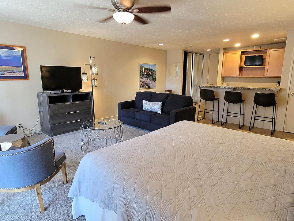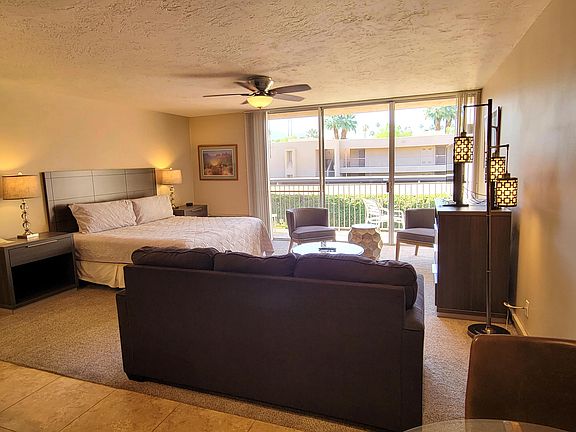 Here it is....your little piece of paradise! Larger studio unit overlooking a peaceful, babbling creek with mountain views. Sold turnkey furnished (towels and linens belong to Shadow Mountain Rental Program) with all the comforts of home and then some! Beautifully decorated and furnished with plenty of living space. Balcony overlooks the running creek with views of the surrounding mountains. Quarterly HOA of $1,612.59 includes ALL utilities, cable and internet! Shadow Mountain Resort offers tennis, pickle ball, swimming, fitness center, pro shop, onsite rental management and allows short term rentals. Main Pool, Tennis and Fitness Center reguire membership (see attached). Next to Shadow Mountain Golf Club. Located blocks from El Paseo for dining and shopping. This one will fly off the shelf so don't wait too long.....