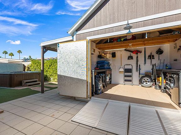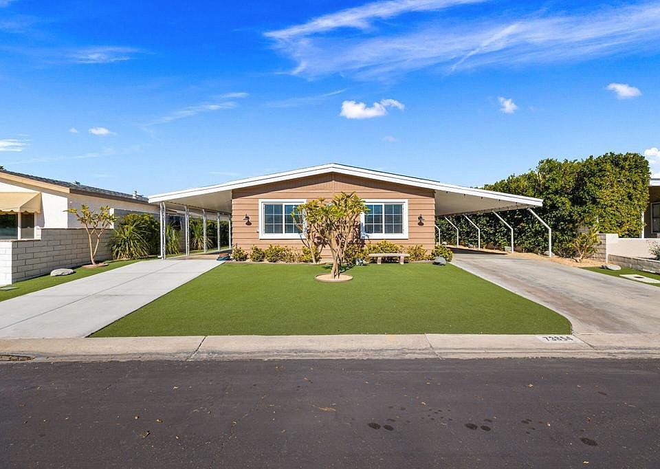 Remodeled 3 bedroom, 2 bath split floor plan with a Golf Cart Garage located in Palm Desert Greens Country Club, a 55+ community with a restaurant on site, a pro shop, Golf, fitness center, and 3 pools. This home features a new spacious kitchen with granite counters, tile back splash, new cabinets, recessed lighting, and a large pantry. Also new HVAC and water heater, remodeled baths, double pane windows, laundry room with granite counter desktop, extra hobby room or office, 4 car covered parking, plus a covered outdoor patio. Cul-de-sac location, beautifully landscaped including artificial turf, and an above ground spa in the back. All this on a permanent foundation to qualify for financing. Solar for lower electric bills too. Low HOA of $351/month includes Free Golf, Paid cable TV, internet and trash.